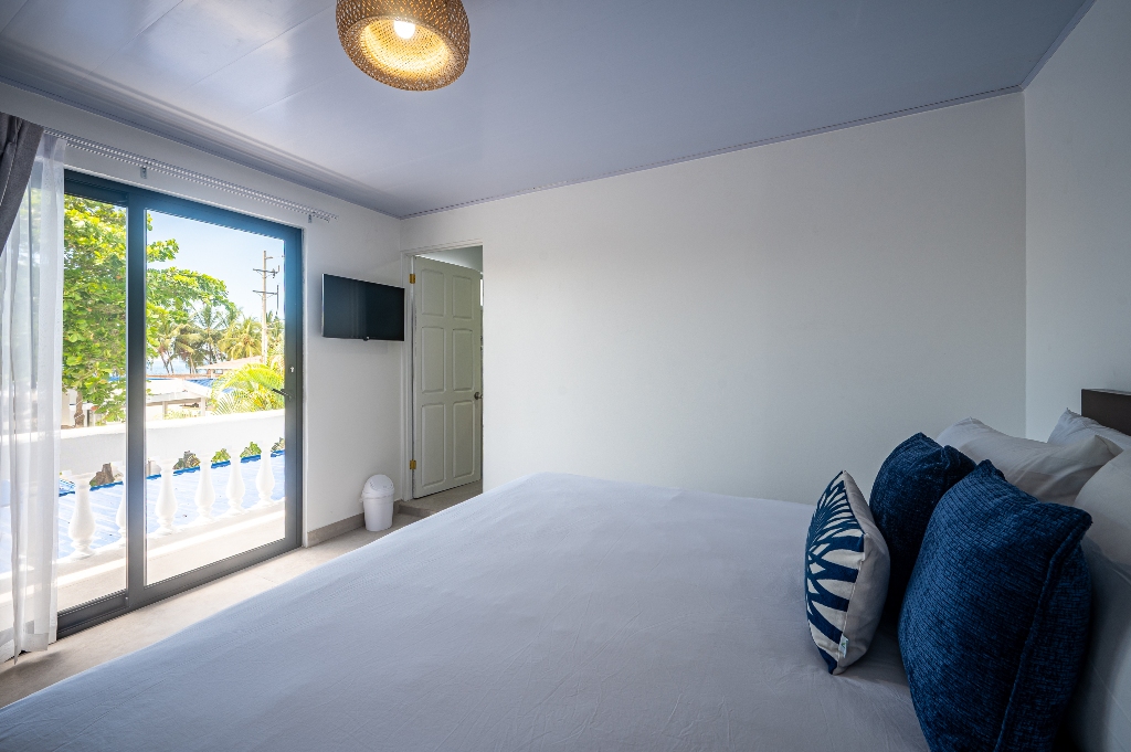 Unwind in our Deluxe Room with Balcony, a serene space designed for both relaxation and productivity. The room features a comfortable king-size bed with fresh bed sheets and bed linen, along with towels, hangers, and a night table with lamps to enhance your comfort.