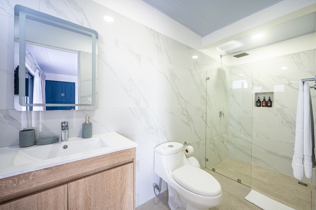 The well-appointed bathroom includes essential amenities such as soap, shampoo, shower, and toilet paper, ensuring a comfortable and hassle-free experience.